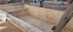 Al terminar la excavación, empezamos a formar las bases de los muros y en este caso usamos block que van reforzados con cabillas y ahogados en concreto; posteriormente se richea y se revocan para dejarlos listos para recibir el Chukum. El piso lleva malla electrosoldada y una capa de 10 cm de cemento para soportar el peso de toda el agua.